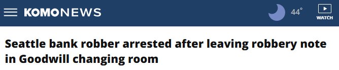 作案字条遗落试衣间,银行抢劫犯被捕KOMO News