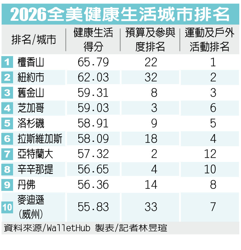 2026全美健康生活城市排名。(资料来源/WalletHub、制表/记者林昱瑄)