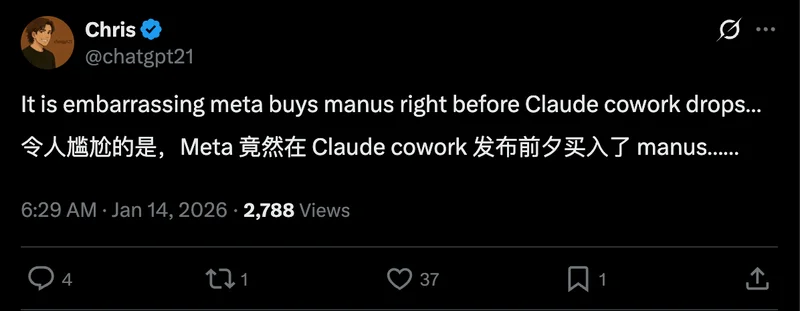 评论区的画风也很有意思,有人直接说「Meta 竟然在 Claude Cowork 发布前夕,买入了 Manus」。