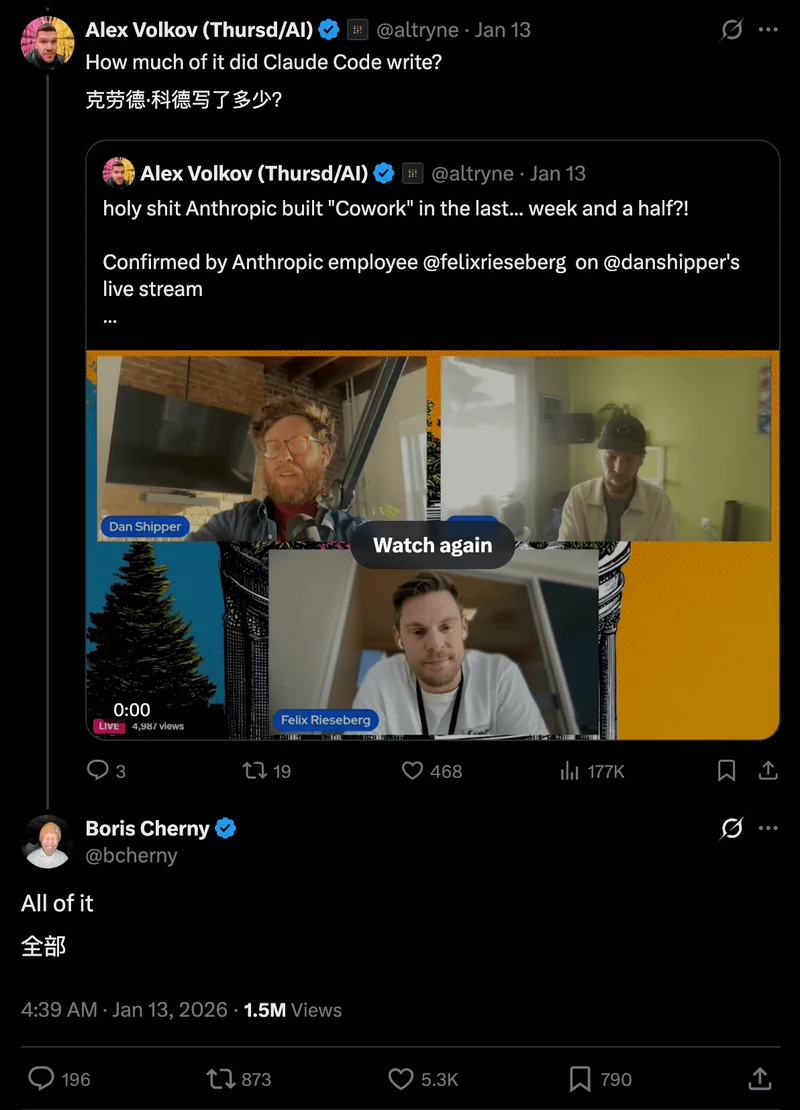 更离谱的是,当有人问「这个 Cowork 有多少代码是 AI 写的」时,Claude Code 的工程师 Boris Cherny 只回了三个字:「All of it」。