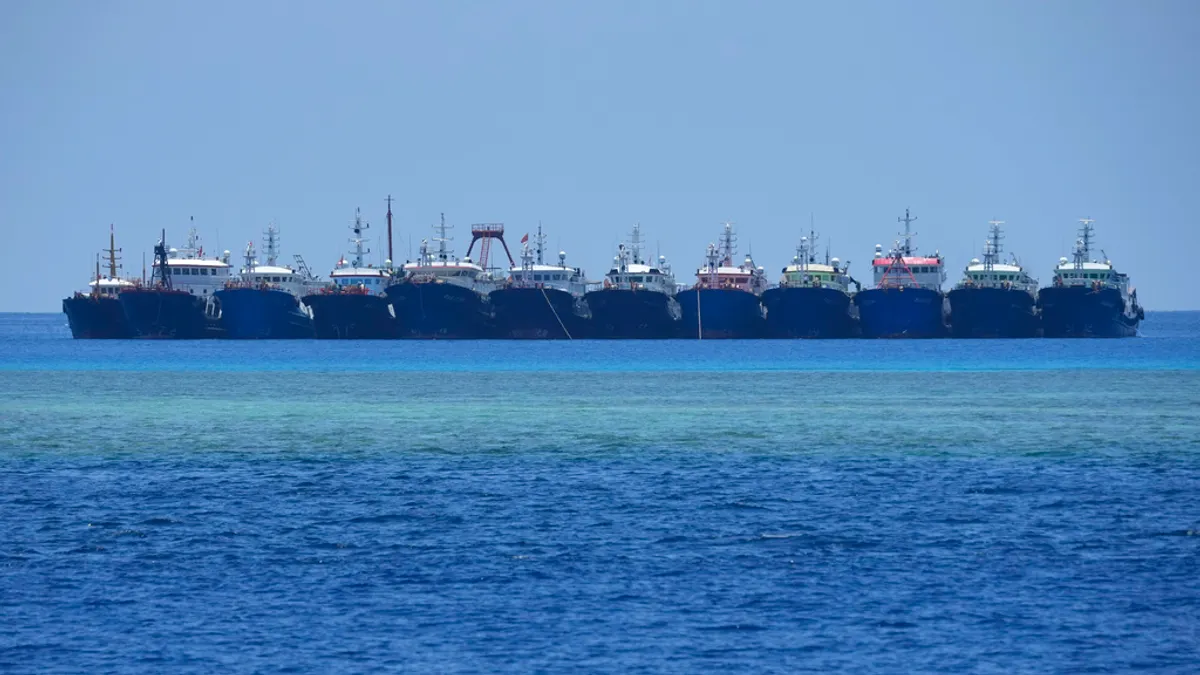 2023年12月2日,疑似中国海上民兵的船只出现在菲律宾声称拥有主权的朱利安・菲利普礁(中国称“牛轭礁”)附近。(美联社)