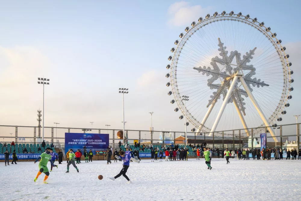 2025年12月20日,参赛球员在哈尔滨冰雪大世界参加大众雪地足球挑战赛。