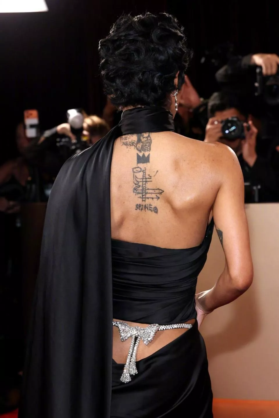 更绝的是配饰的搭配思路,别人都把珠宝戴在颈间、耳畔,她却另辟蹊径,将一枚钻石蝴蝶结缀在后腰正中央。