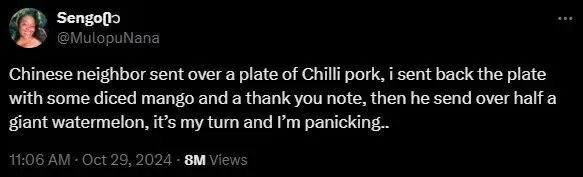 “叮咚——”门铃响起。博主 Sengoᥫ @MulopuNana 透过猫眼看到,门外站着的是刚刚搬来的中国新邻居。她带着几分好奇打开了门,只见这位中国邻居二话不说,直接端上来一盘经典的中国家常菜——辣椒炒肉。