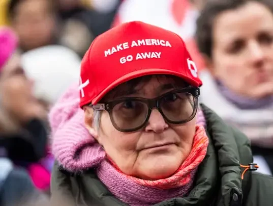 ▲抗议者戴着写有“Make America Go Away”的帽子