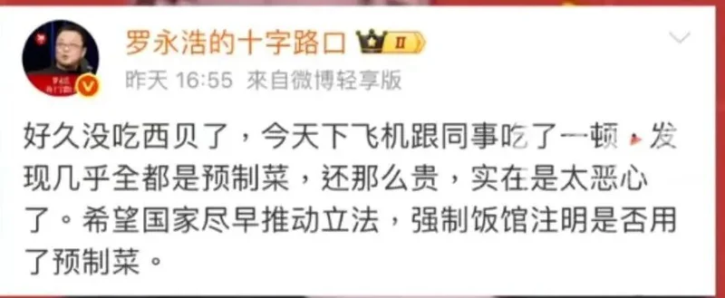 当然,罗永浩是一个网络大V,说话需要谨言慎行,但问题是,他这则帖子也仅仅只是提了一嘴预制菜。如此,现在是不是预制菜,已经周所周知。