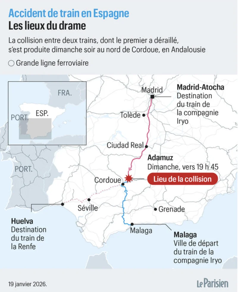 事故发生在昨天傍晚,大约18点40分。一列由私营公司Iryo运营的高速列车,从马拉加(Málaga)出发,以近200公里/小时的速度向北驶往马德里(Madrid)。车上有三百多名乘客,有的是周末返程,有的是准备换乘,有人只是结束了一次短途出行,想尽快回家。