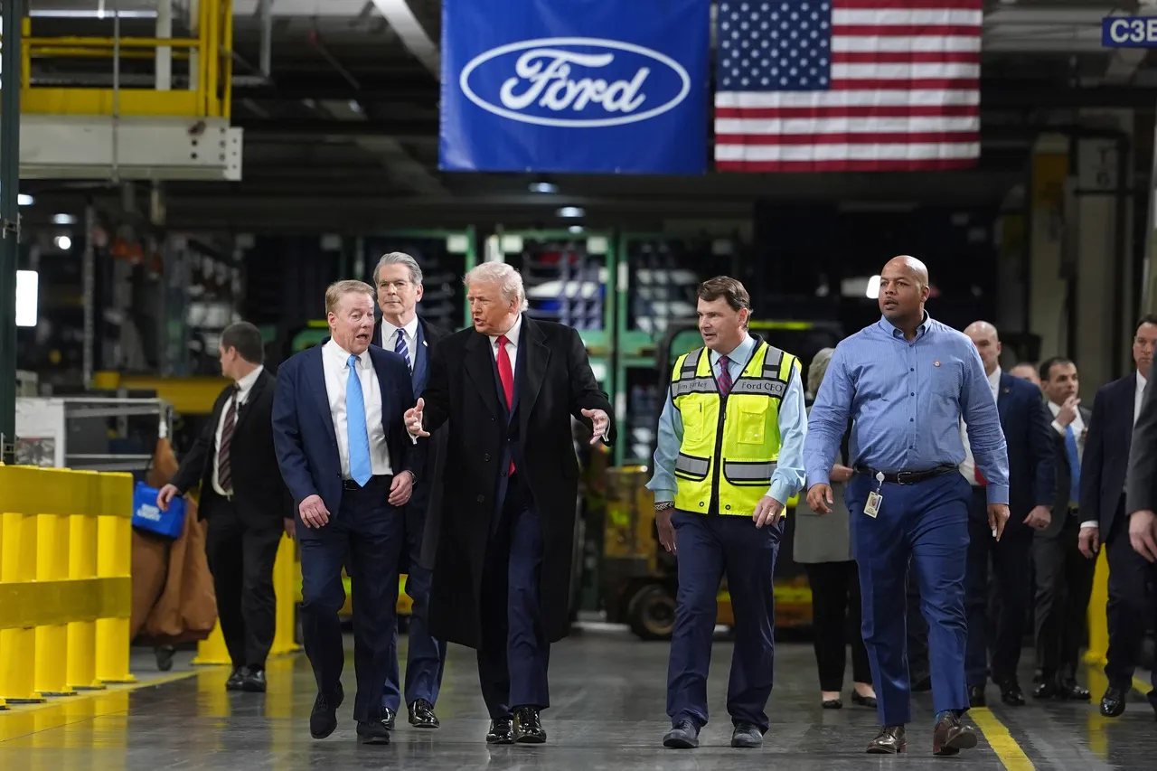 美国总统川普(左二)访问美国福特汽车厂。美联社