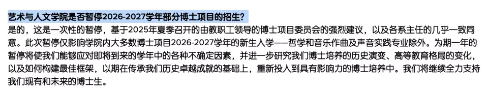 芝加哥大学艺术与人文学院网站上关于暂停博士项目招生的回答