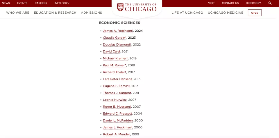 芝加哥大学经济学中获得诺贝尔奖的得主名单节选