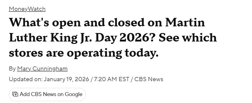 Costco当天将正常营业。马丁·路德·金纪念日不在其年度关店假日之列,消费者可通过官网查询当地门店的具体营业时间。