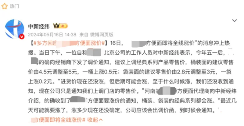 除了选择和健康,价格因素也在悄然影响人们对方便面的态度。曾经 1 块钱一袋方便面的时代早已经一去不复返,据中新经纬报道,2024 年 5 月下旬,某知名品牌方便面调整售价,其中,袋装方便面建议零售价由 2.8 元提升至 3 元,而经典桶装方便面则从 4.5 元提升至 5 元,据称是因为产品配方升级导致成本的增加。