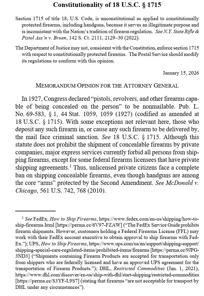 这份长达15页的意见书由司法部法律顾问办公室(Office of Legal Counsel)于2026年1月15日(周四)发布,针对的是1927年通过的18 U.S.C. § 1715条款。该条款将“可隐蔽携带的手枪、左轮手枪及其他可藏于身上的火器”列为不可邮寄物品,仅允许政府官员或持有联邦枪支许可证(FFL)的经销商例外。