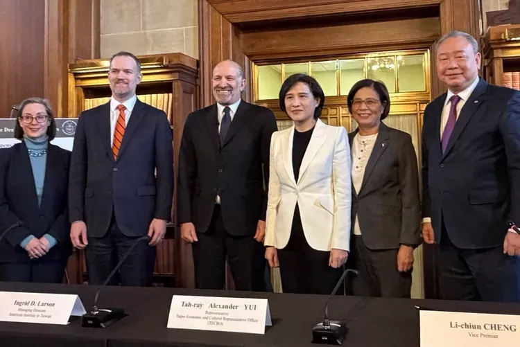 台美关税谈判落幕,左起为AIT执行理事蓝莺、美国贸易代表葛里尔、美国商务部长卢特尼克、行政院副院长郑丽君、总谈判代表杨珍妮、驻美代表俞大㵢。行政院提供