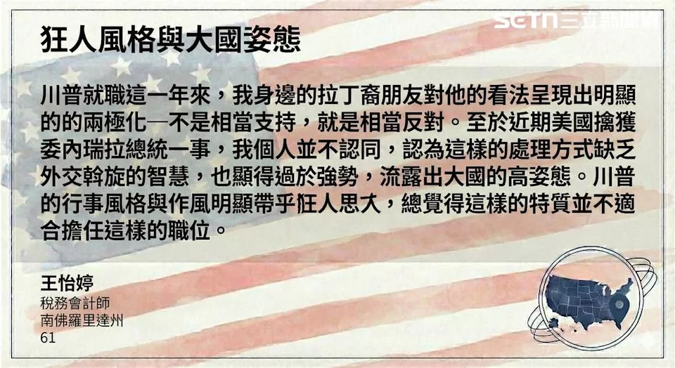 迈阿密台商会长王怡婷认为川普的狂人性格不适合担任总统一职(图/记者彭光伟排版、gemini制图)