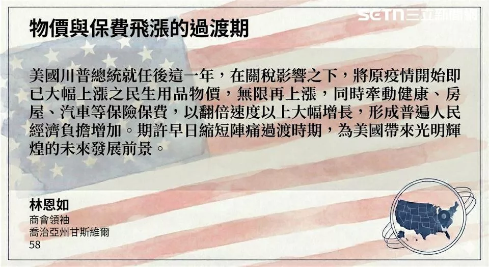 乔治亚州甘斯维尔台商会长林恩如认为川普2.0上任这一年,物价、保费飙涨已经让基层民众吃不消。(图/记者彭光伟排版、gemini制图)