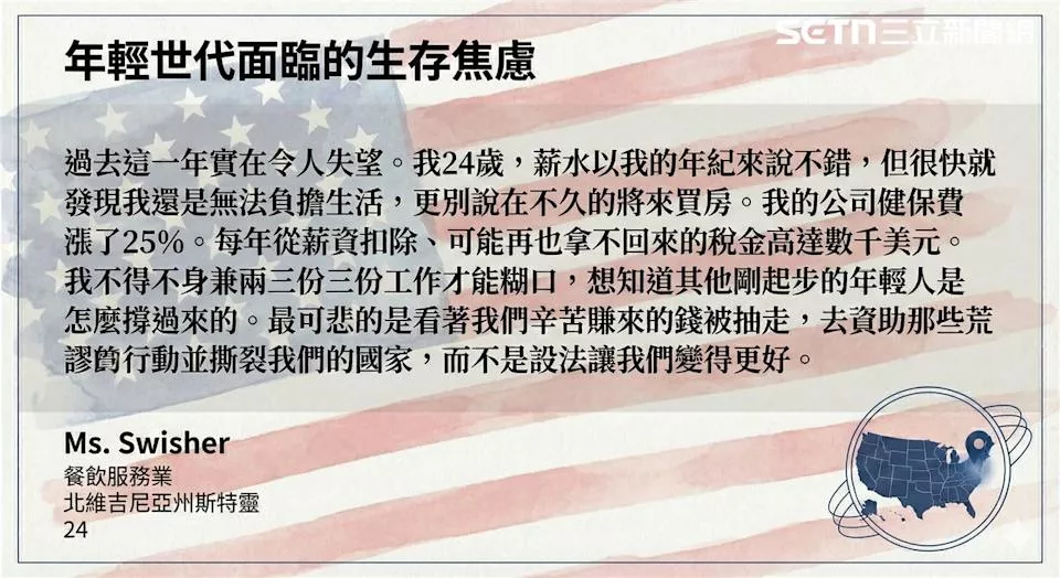 24岁的Swisher对川普2.0执政一年后的美国生活成本感到焦虑(图/记者彭光伟排版、gemini制图)