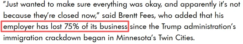 他还表示,自特朗普政府在双子城加强移民执法行动以来,当地的雇主已损失了近75%的生意。