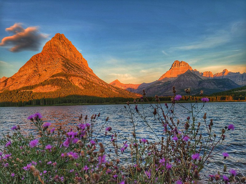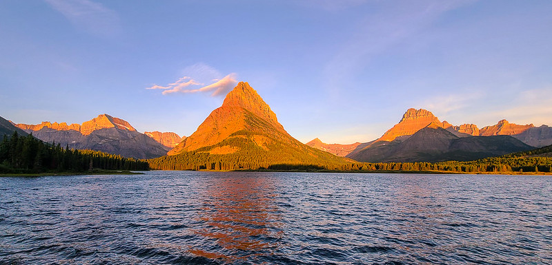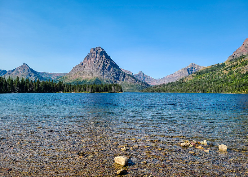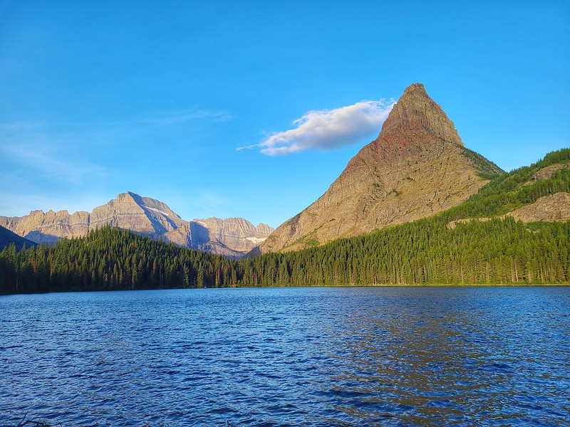 1. Sinopah Mountain, 金字塔一样的山峰耸立湖面。 孤独而神圣地挺立在碧波之上。冰川公园的山峰仿佛都被大自然精雕细琢过,线条独特且优美。