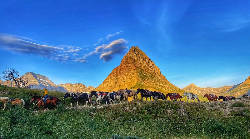 只听见一阵清脆的叮叮当当声,一支马队正缓缓穿行在山迹之间。此时,背景正是被日出染成灿烂金色的 Grinnell Point。大约 20 多匹骏马鱼贯而行,领头的和垫后的牛仔骑在马上,身姿挺拔,简直帅呆了!