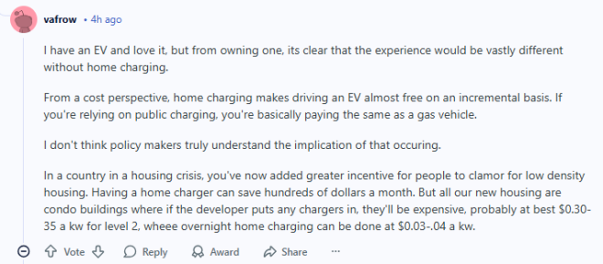 在一个本来就有住房危机的国家,你等于又给了大家一个去抢低密度住房的理由。有家用充电桩,每个月能省好几百块钱。可问题是,我们新建的房子几乎全是公寓,就算开发商装了充电桩,价格也不便宜----二级慢充大概 $0.30-0.35/度电;而在家夜间充电,只要 $0.03-0.04/度电。