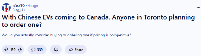 在Reddit论坛的多伦多板块(r/askTO),这个问题吸引了不少网友前来讨论----随着中国电动车进入加拿大市场,有人打算订购一辆么?