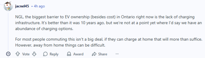 不瞒你说(NGL),在安省,除了价格之外,电动车普及最大的障碍就是充电基础设施不足。确实比10年前好一些了,但还远没到“充电点到处都是”的程度。对大多数上下班通勤的人来说,如果能在家充电,其实问题不大,已经完全够用。但一旦离开家,事情就会变得麻烦。