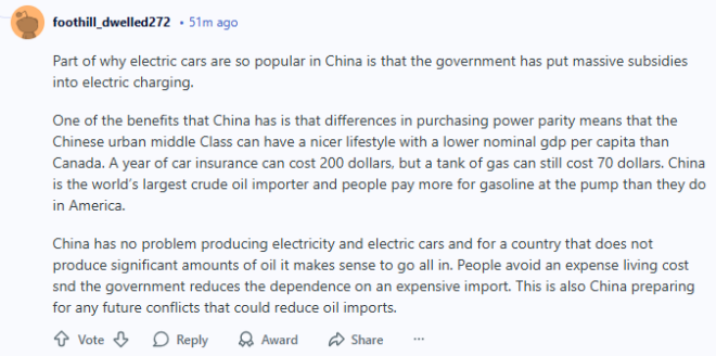 中国不缺电,也能自己生产电动车。对于一个几乎不产油的国家来说,全力发展电动车本来就很合理----老百姓省生活成本,政府也能减少对昂贵能源进口的依赖。同时,这也是中国在为未来可能影响石油进口的冲突做准备。