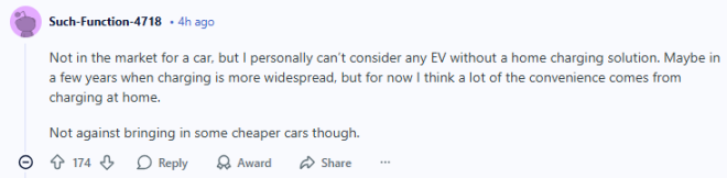 我现在并不打算买车,但说实话,没有家用充电条件的电动车,我个人根本不会考虑。也许再过几年,等充电设施更普及了再说,但至少目前来看,电动车最大的便利性,还是来自在家充电。不过,我也不反对引进一些更便宜的车型。