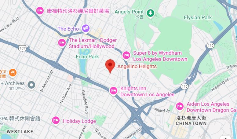 洛杉矶市天使高地(Angelino Heights,地图红色标注点)近日一家居咖啡室开业,即以其充满社区温度的特色,成了当地热门去处。(取材自Google Map)