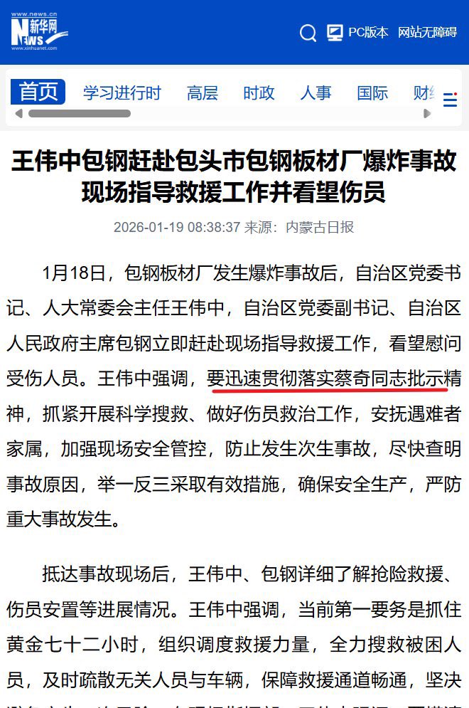 内蒙古自治区党委书记王伟中前往包钢爆炸事故现场指导救援工作,他强调,要迅速贯彻落实蔡奇同志的批示精神。类似的批示往往只有习近平的名字,李强的名字都很少见,省委书记要迅速贯彻落实蔡奇同志的批示精神,那么习近平呢?是爆炸规模达不到习近平批示的标准,还是蔡奇接管了习近平的部分权力,这下自媒体又热闹了。