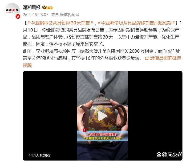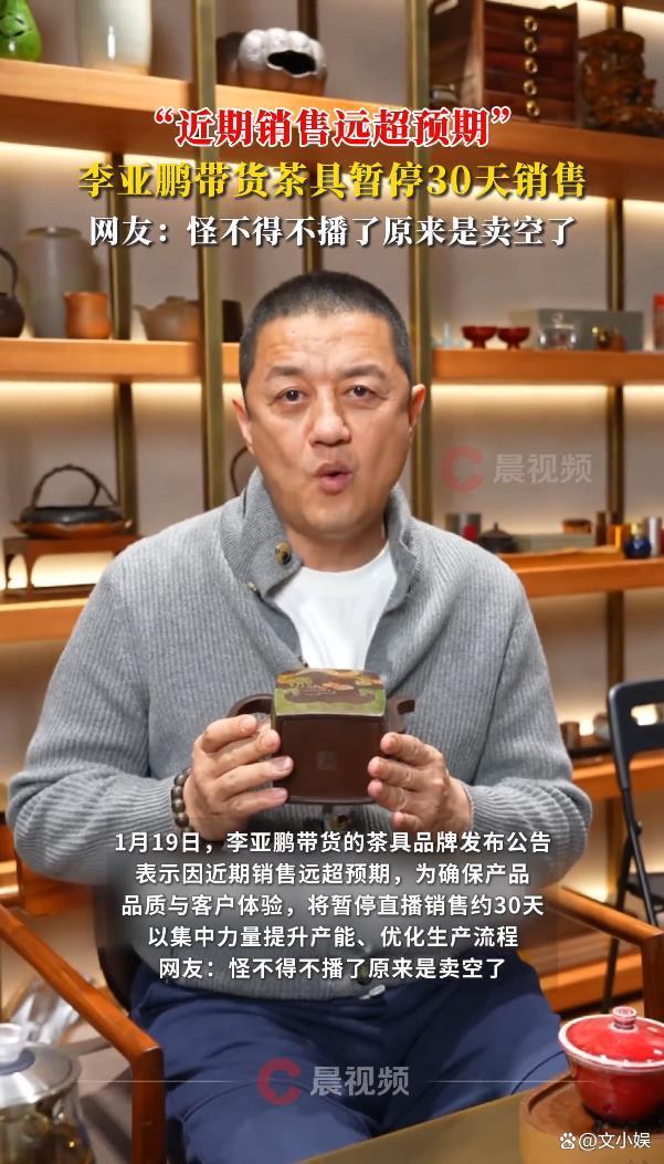 据1月19日晚间报道,最近,李亚鹏带货的茶具品牌突然宣布暂停直播销售一个月,理由是“卖得太猛,实在跟不上了”——这波“凡尔赛式”的停播,瞬间在网络上炸出了一片热议。