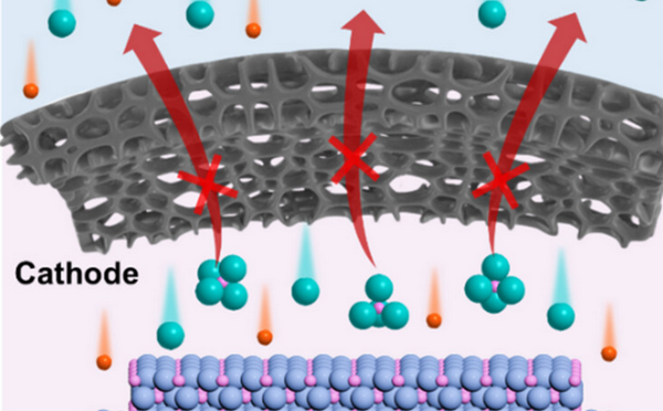 该“筛网”孔径为0.54纳米,可允许尺寸约为0.15纳米的锂离子自由传输,同时限制尺寸约为0.8纳米的二氟化钴衍生络合离子在正极区域内,从而抑制活性材料的溶解流失,提升界面反应效率。