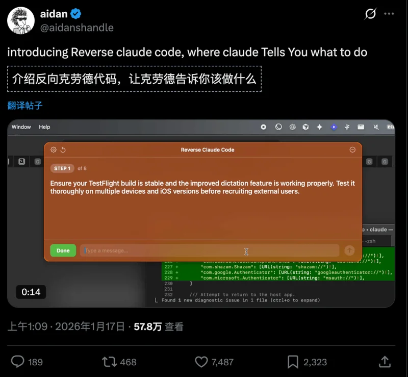 2026年1月17日,Midjourney的一位工程师在X上发布了一段视频,标题是「Reverse Claude Code」。