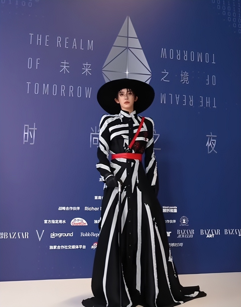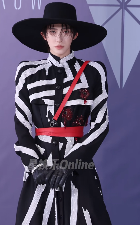 这次他选择了法国设计品牌的黑白贴条拖地大衣,配上大大的礼帽,颇有种马戏团的风格。