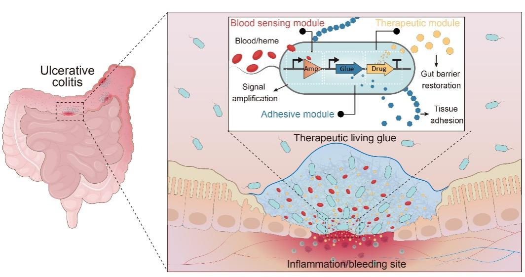 该研究以工程化肠道细菌为载体,能够感知肠道出血信号,在病灶处原位形成兼具黏附与治疗功能的生物胶基质,实现“感知—定位—治疗”一体化干预,为炎症性肠病精准治疗提供了新的合成生物工程思路。