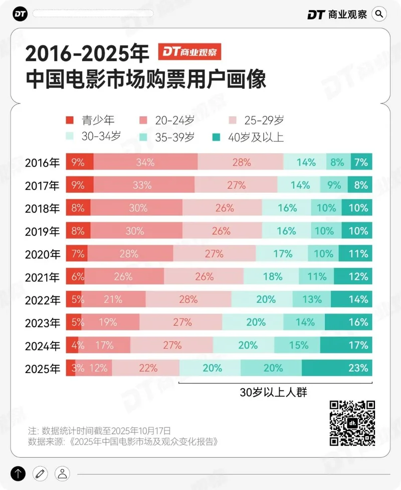 根据灯塔专业版数据,2025年30岁及以上购票观众占比达63%,相比2016年增长了34个百分点。