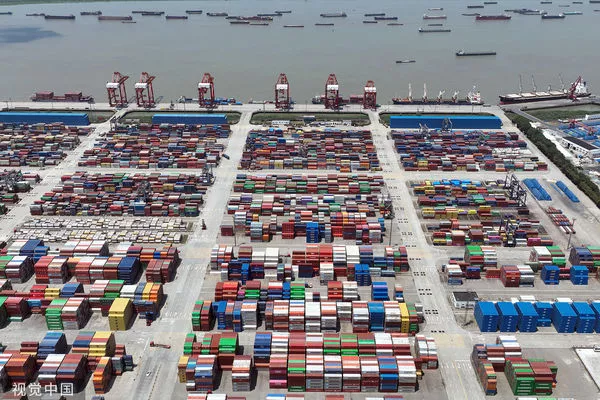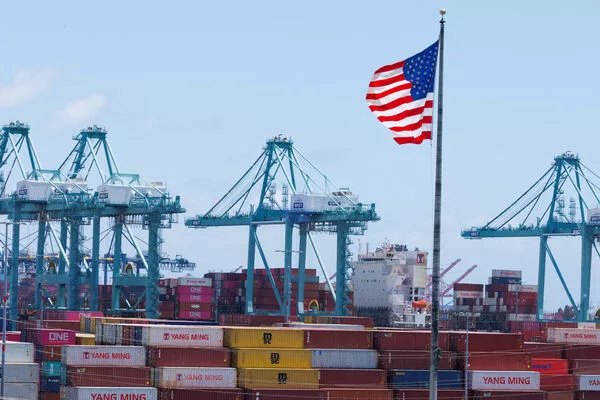 ▼洛杉矶港一艘挂着美国旗帜的货轮 。