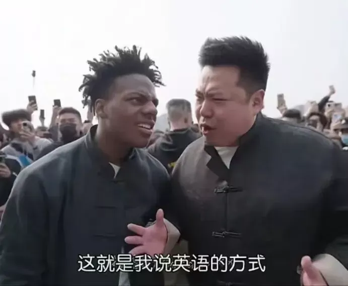 海外网友第一次注意到他,是在2025年4月。他与美国网红 IShowSpeed(国内称“甲亢哥”)在重庆直播同框,标准的“川式英语”让 IShowSpeed当场愣住。更让人意外的是,他从未去过美国,英语完全是自学的。