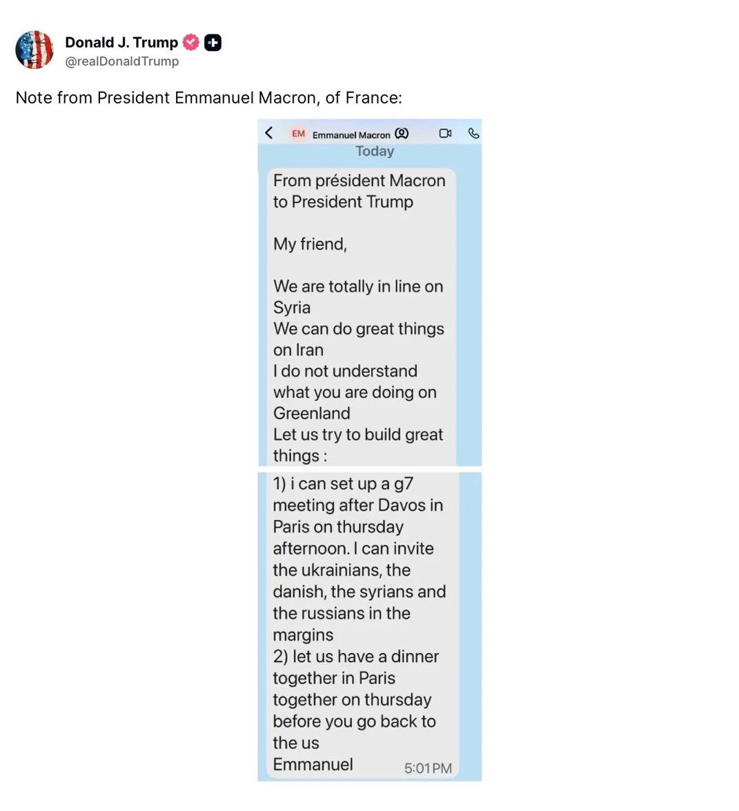 “我的朋友,我们在叙利亚问题上完全一致。我们可以在伊朗问题上做成大事。我不明白你在格陵兰岛上做什么。让我们一起做大事吧:1) 我可以在达沃斯会议之后,于周四下午在巴黎安排一场G7会议。我可以邀请乌克兰人、丹麦人、叙利亚人、俄罗斯人在场边。2) 让我们一起在巴黎共进晚餐,在你返回美国之前,周四晚上一起吃晚饭。”
