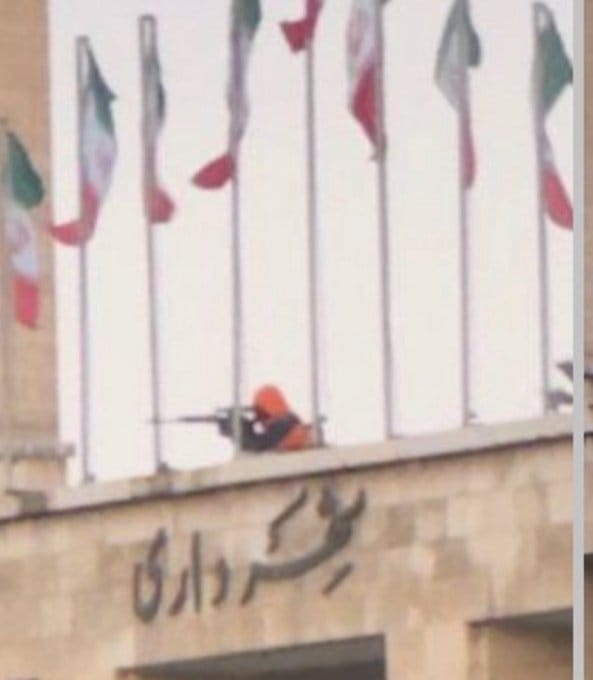 在伊朗大三大城市伊斯法罕市内,一位当局部署的狙击手瞄准位于市政大楼楼顶的抗议民众,准备发动攻击。 图:翻摄自 @Wangwenhaha0518 X 帐号