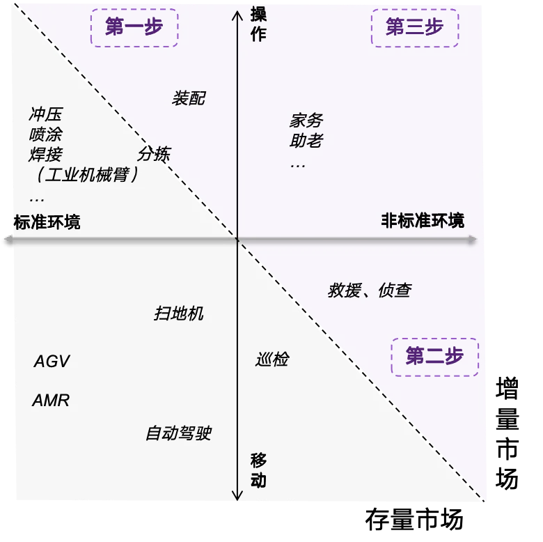 我们认为更好的选择是一个维度是——要么在标准化场景下做复杂操作,要么在非标环境下做简单移动。