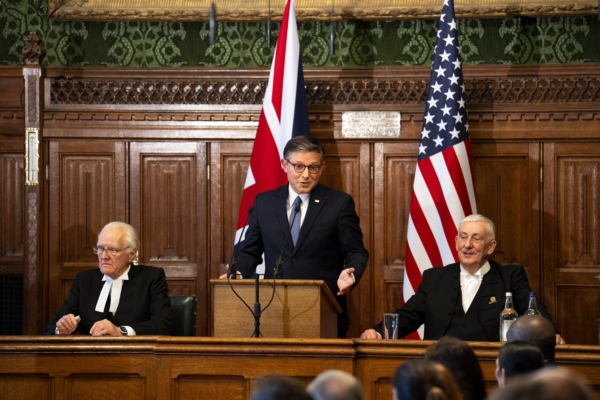 2026年1月20日,英国伦敦,美国众议院议长约翰逊(中)在下议院与上议院议长麦福勋爵(左)及下议院议长霍伊尔爵士(右)共同向国会议员发表演说。为纪念美国建国250周年,即《独立宣言》签署250周年,约翰逊成为首位在任内向英国议会发表演说的美国议长。(Jordan Pettitt - WPA Pool/Getty Images)
