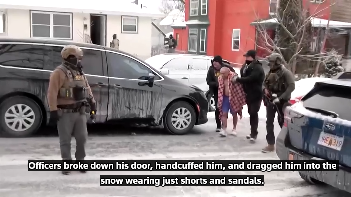 据美联社报道,上周末,联邦移民执法人员在没有出示搜查令的情况下,强行闯入一名苗裔男子家中,持枪将他拘捕。这名男子随后被迫只穿内裤在严寒中被带走,尽管他最终被证实是一名没有犯罪记录的美国公民。