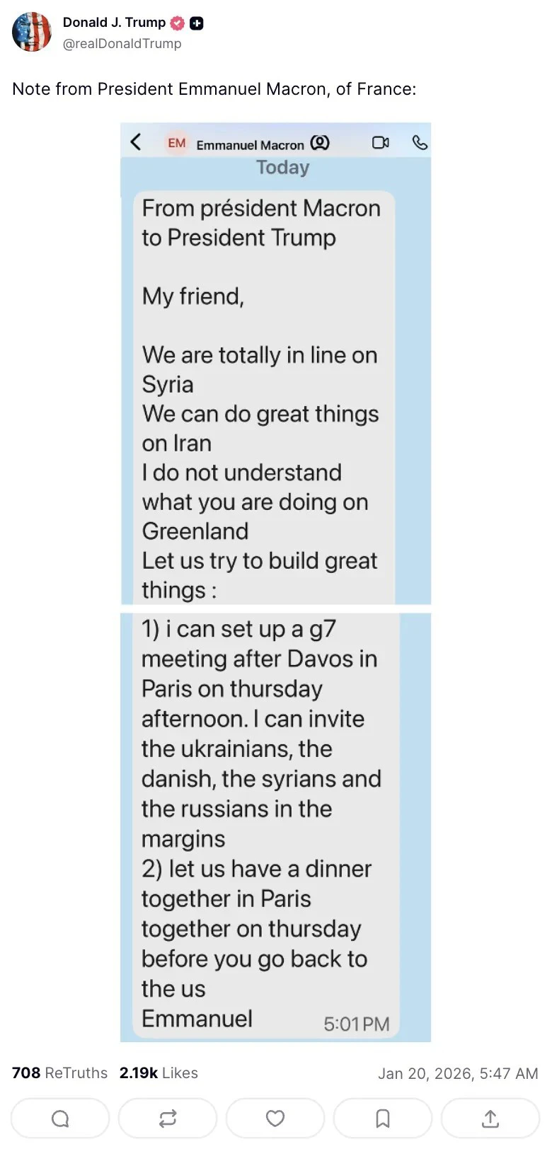 川普还公布了马克龙发出的信息,内容显示,马克龙邀请川普22日在巴黎共进晚餐,并与乌克兰、叙利亚、丹麦和俄罗斯方面举行会晤,但他提到“我不懂你在格陵兰做什么,让我们一起尝试打造伟大的事物。”