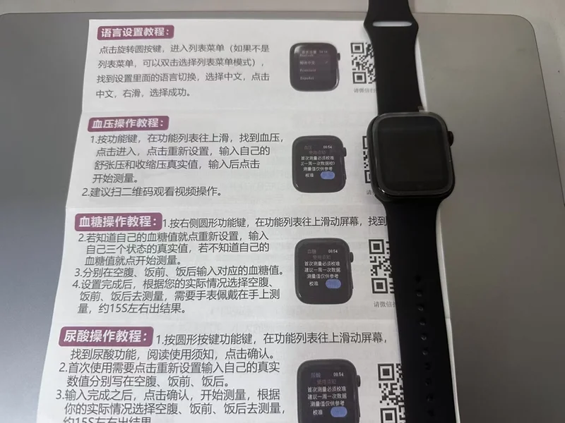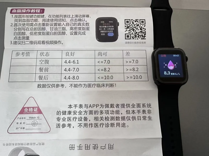 网上售卖的“无创血糖手表”真的能测血糖吗?记者从某网络购物平台下单了一款宣称为“2025德国进口”的智能手环,原价99元优惠价30元,其功能包括测血糖、血压、尿酸、血脂、心率等。收到货后打开包装,里面有一块智能手表和一张使用说明书,还附带有二维码可扫码观看操作视频。