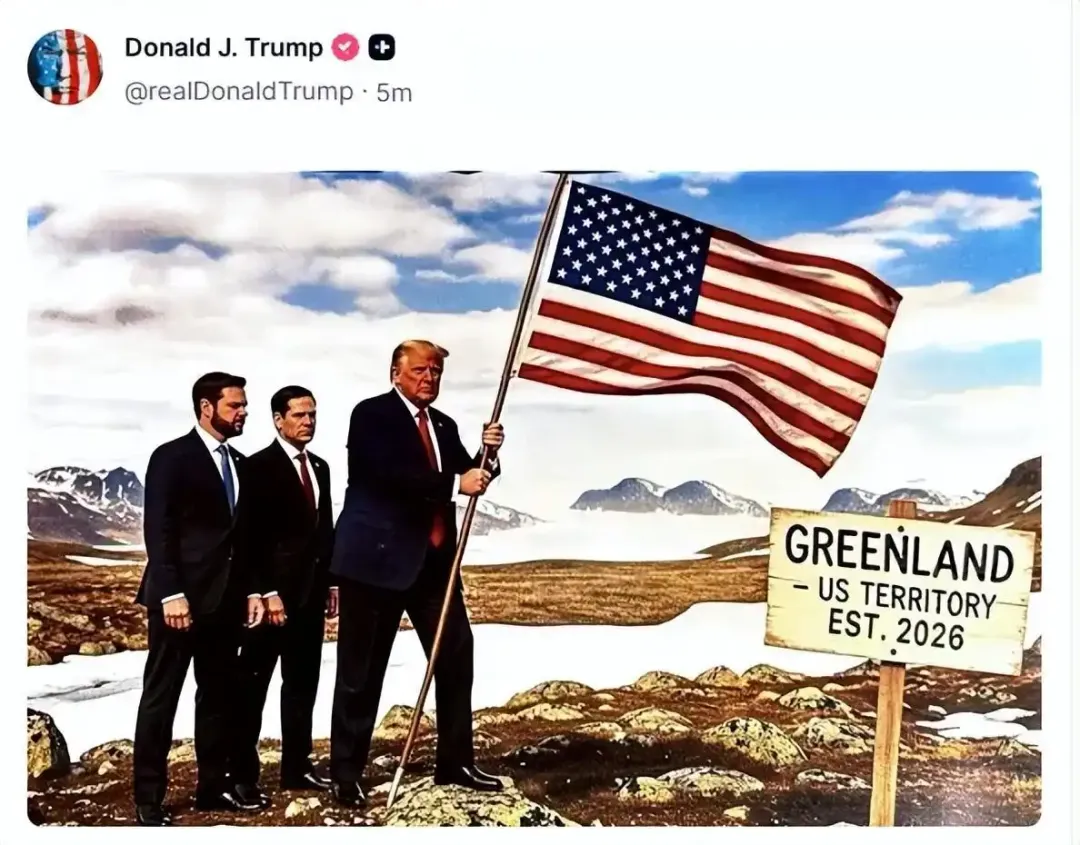 1月20日,据新华国际消息,美国总统特朗普20日凌晨在社交媒体上发布图片,他手拿美国国旗登上格陵兰岛,身后站着美国副总统万斯和国务卿鲁比奥,旁边指示牌上写着“格陵兰岛2026年成为美国领土”。