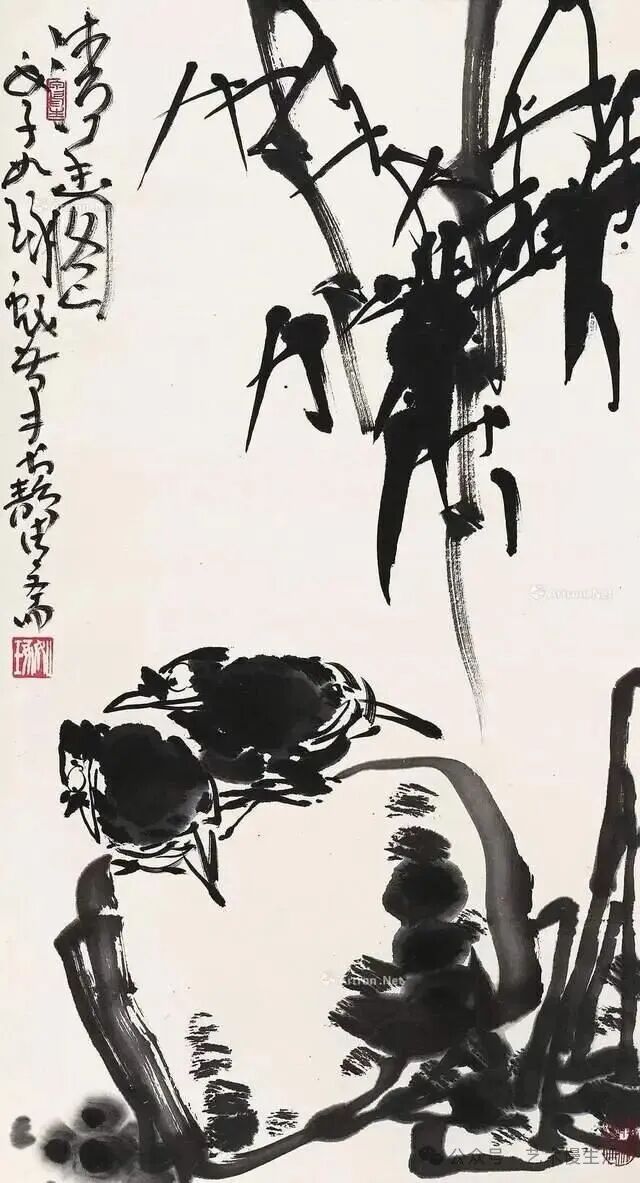崔如琢的核心艺术成就在于指墨创作的继承与革新,被学界评价为“振兴指墨的洪钟”和“指墨艺术新里程碑”。他将指墨、积墨、泼墨技法深度融合,指掌并用,既保留指痕的灵动韵律,又兼具泼墨的雄浑气势,在巨幅作品中实现酣畅淋漓的视觉表达。其独创的指墨书法融合篆魏技艺,既有篆书古朴,又含魏碑雄健,展现出深厚功力。