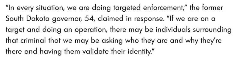 国土安全部部长Kristi Noem也在采访中回应,“在任何情况下,我们都在进行有针对性的执法。如果我们正在执行行动,而周围有人围绕,我们可能会询问他们是谁,为什么在那里,并让他们确认身份。”