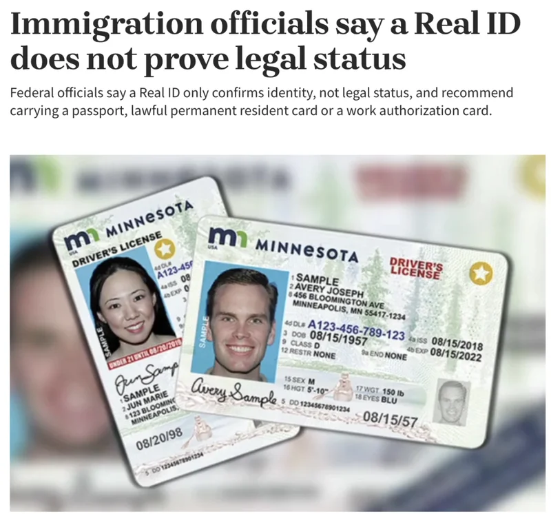 明尼苏达州的一位律师表示:最近她的多位客户在遭遇盘查时向 ICE 出示了 Real ID,但执法人员却明确告知:“这些还不够(Wasn't good enough)。”